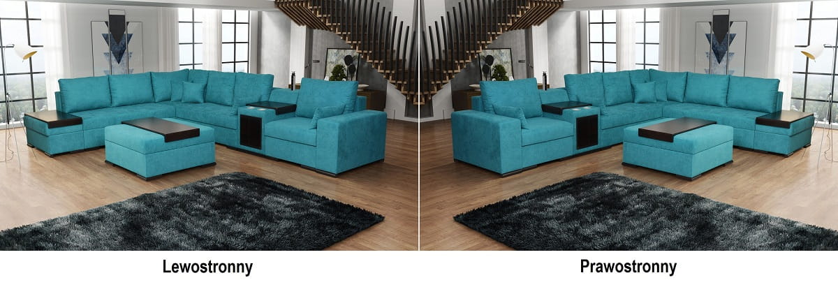 | Wymiary | szerokość: 379 cm, głębokość od lewej: 296 cm głębokość od prawej: 93 cm wysokość boczku: 60 cm, wysokość mebla z poduszką: 95 cm, wysokość mebla bez poduszki: 75 cm, wysokość siedziska: 45 cm |