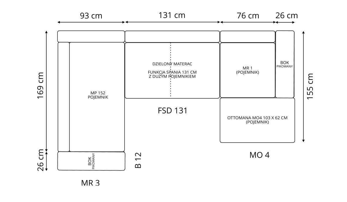 | Wymiary | szerokość: 329 cm, głębokość od lewej: 196 cm, głębokość od prawej: 156 cm, wysokość boczku: 60 cm, wysokość mebla z poduszką : 95 cm, wysokość mebla bez poduszki : 75 cm, wysokość siedziska: 45 cm |