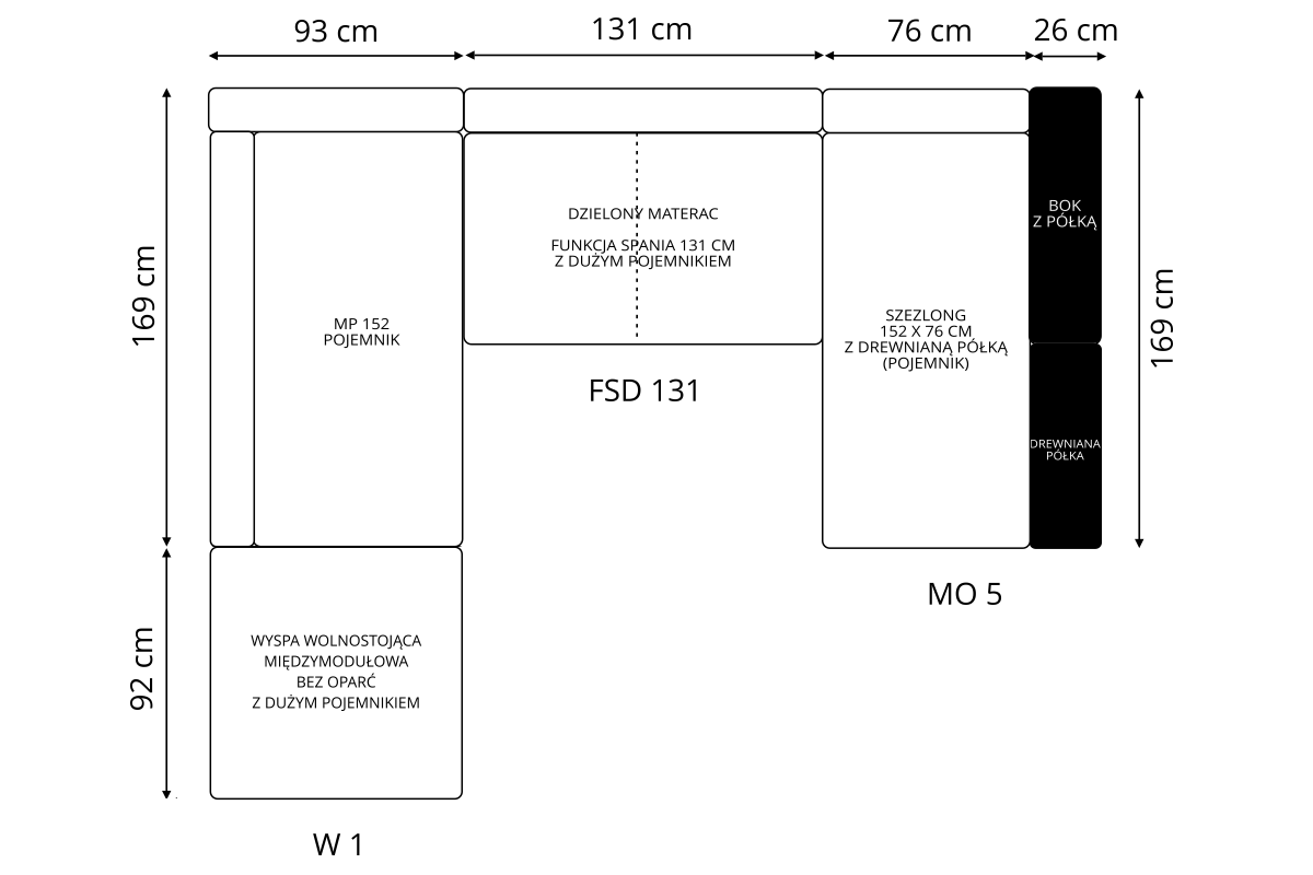 | Wymiary | szerokość: 329 cm, głębokość od lewej: 263 cm, głębokość od prawej: 168 cm, wysokość boczku: 60 cm, wysokość mebla z poduszką : 95 cm, wysokość mebla bez poduszki : 75 cm, wysokość siedziska: 45 cm |