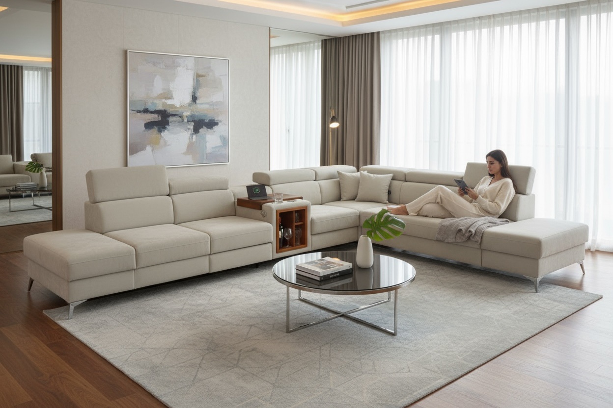 W standardzie narożnik wyposażony jest w elektryczną funkcję relax siedziska, barek, regulowane zagłówki, pojemnik na pościel. Dodatkowym plusem systemu HERON jest możliwość doposażenia swojego mebla w funkcjonalne dodatki typu rozkładany blat pod laptopa, listwa z gniazdami 230v i USB, system audio, półki w bokach czy oparciach, ładowarki indukcyjne, podświetlane LED w pojemnikach na pościel itp.