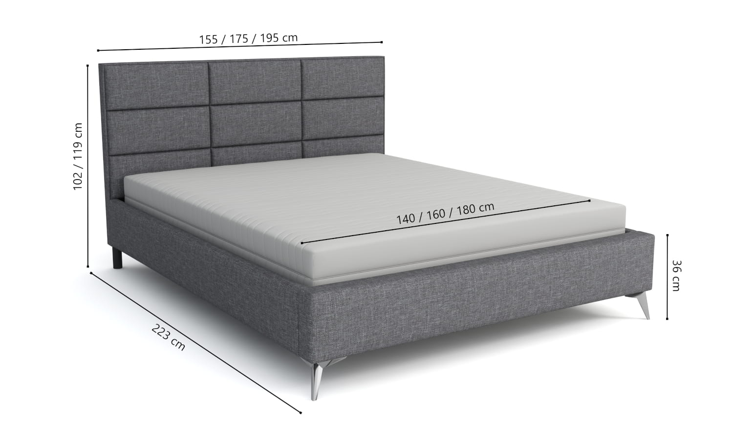 | Dostępne wymiary pod materac: | 140x200 cm, 160x200 cm, 180x200cm |