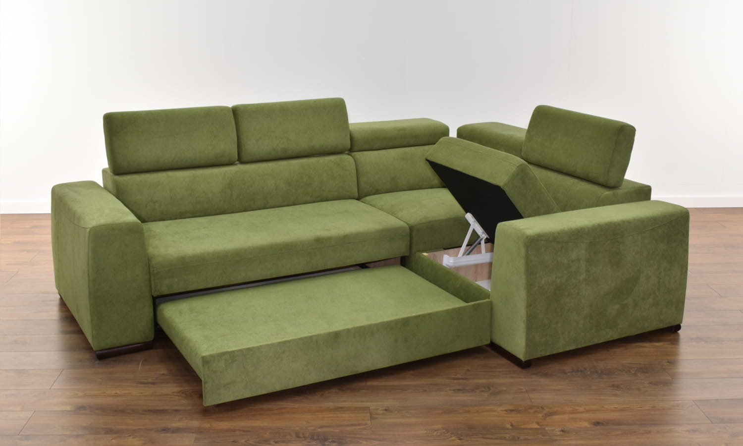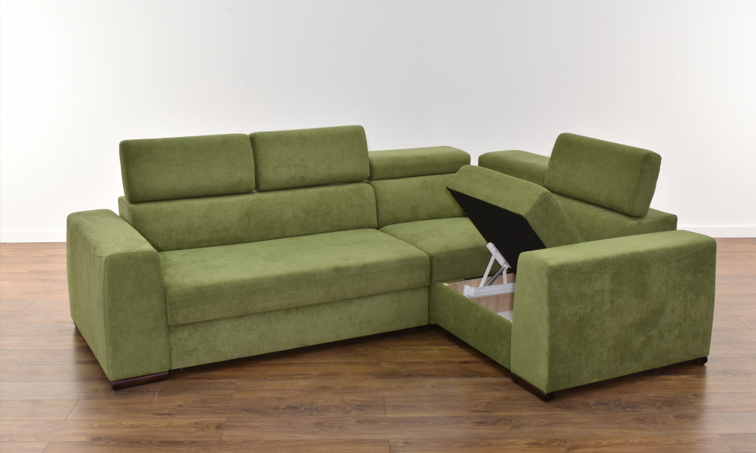 Konstrukcja narożnika zbudowana jest z litego drewna oraz płyty meblowej, dzięki czemu jego szkielet jest bardzo wytrzymały. Za wygodę siedzenia i spania odpowiedzialne jest wyposażenie siedzeń i oparć w sprężyny faliste i elastyczne pasy tapicerskie, które pokryte są grubymi warstwami pianki wysoko-elastycznej.