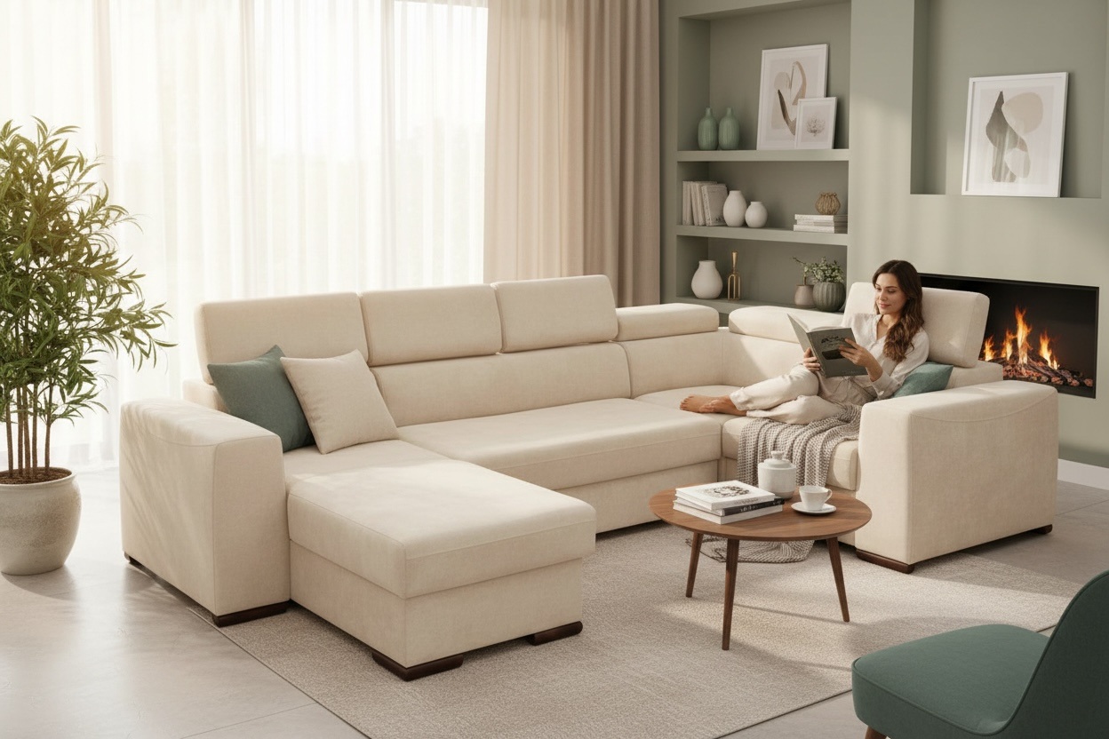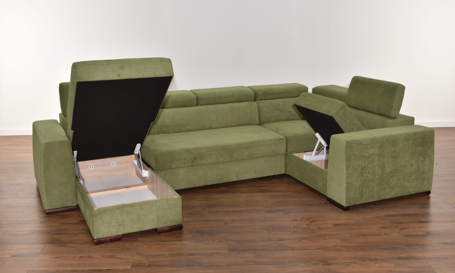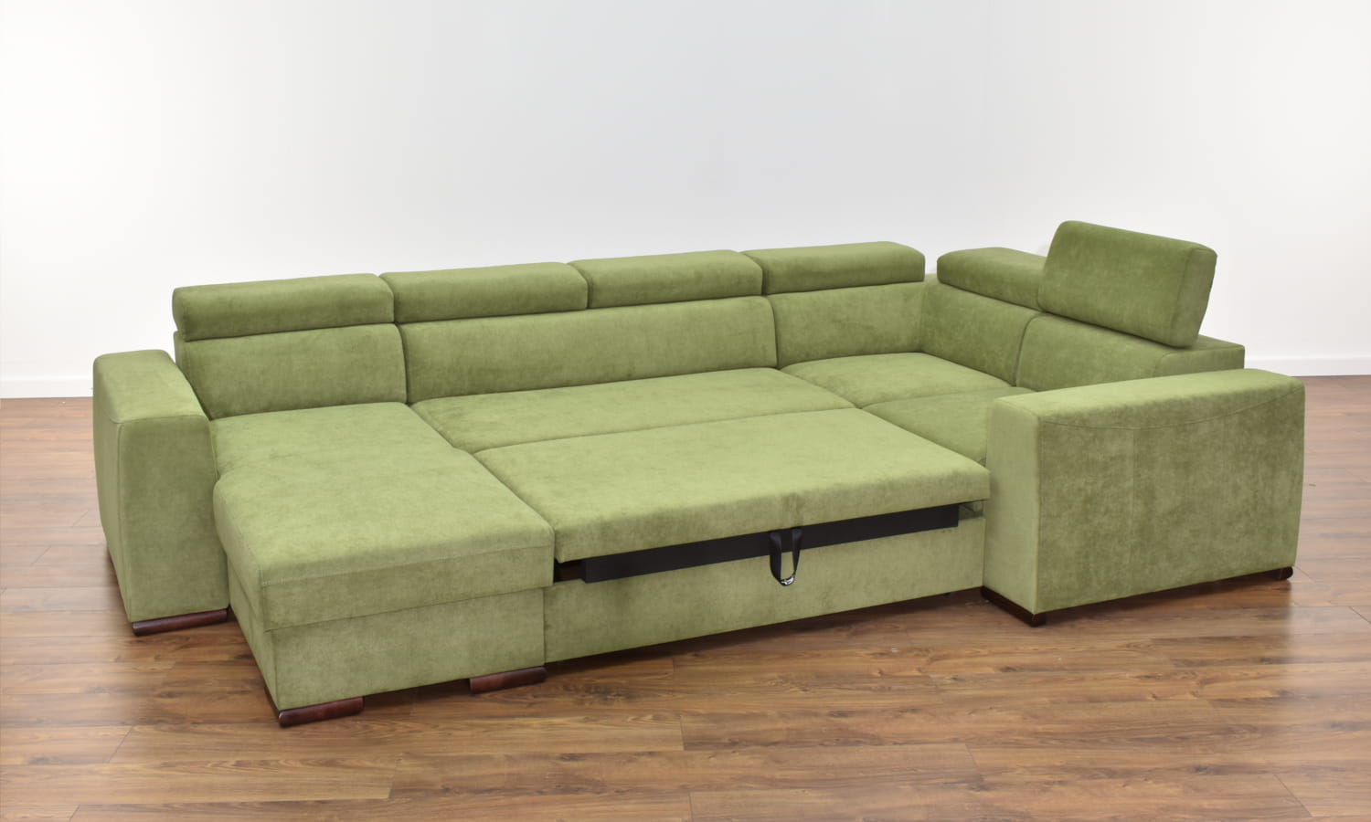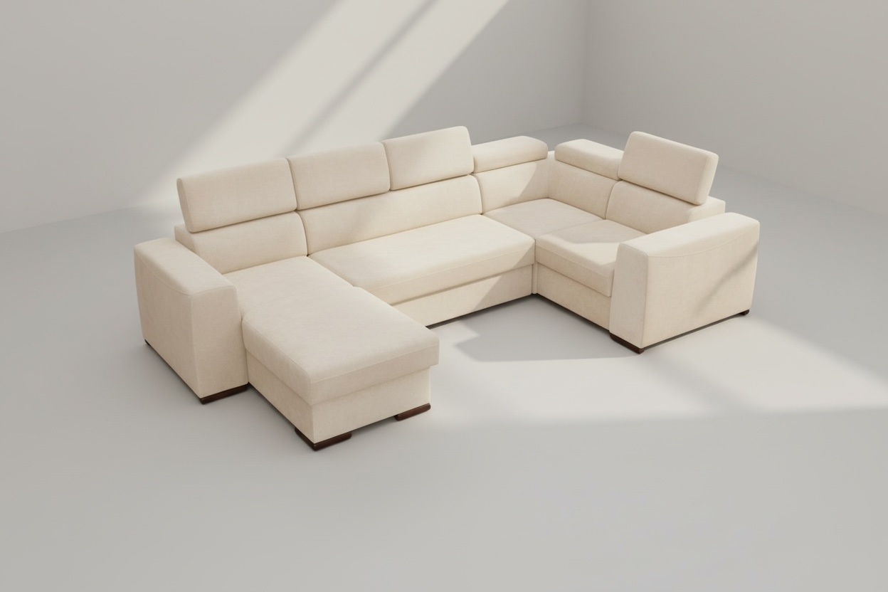 W standardzie narożnik wyposażony jest w regulowane zagłówki, pojemnik na pościel, a co najważniejsze narożnik posiada funkcję spania o sporych wymiarach.