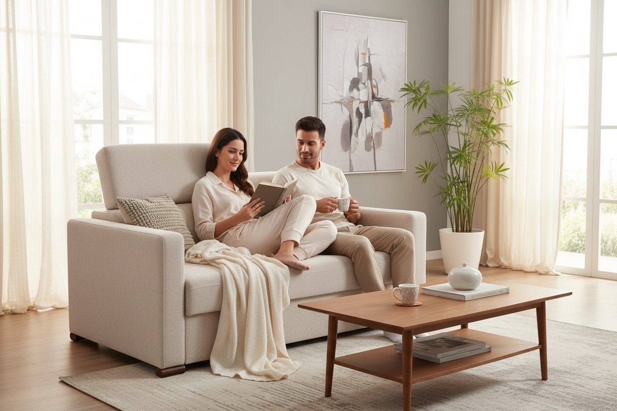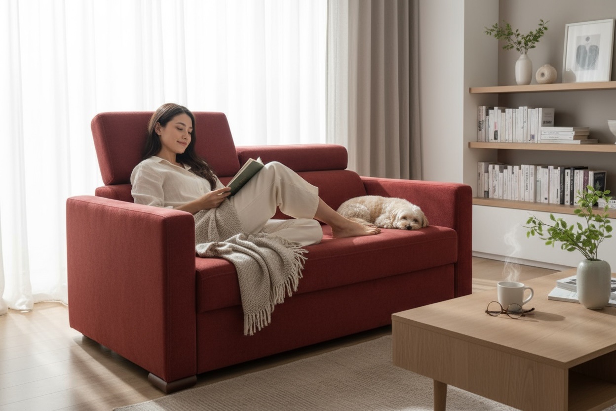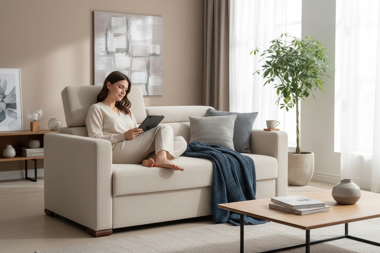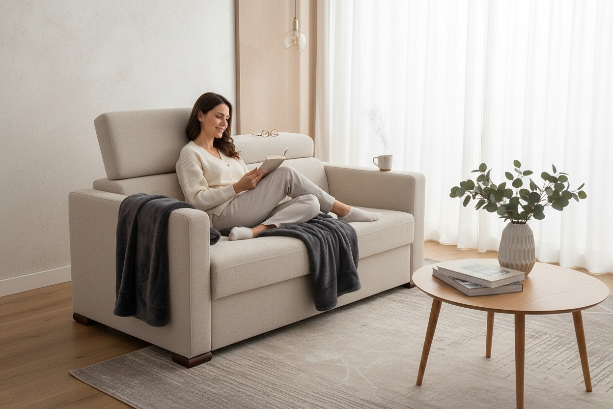 W standardzie sofa wyposażona jest w regulowane zagłówki i pojemnik na pościel.